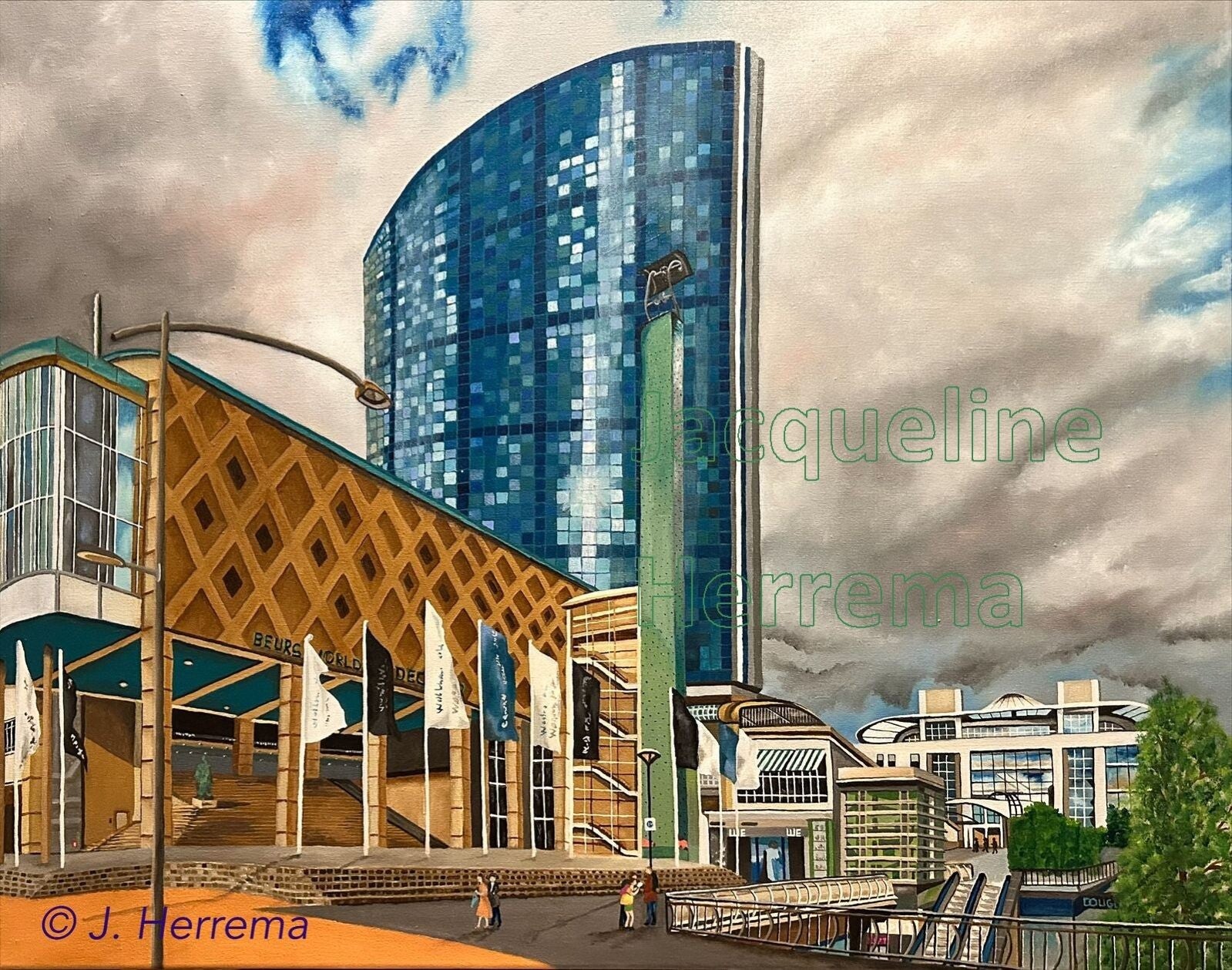 Dit olieverfschilderij toont het iconische Beurs-World Trade Center (WTC) in het hart van Rotterdam, van Jacqueline Herrema