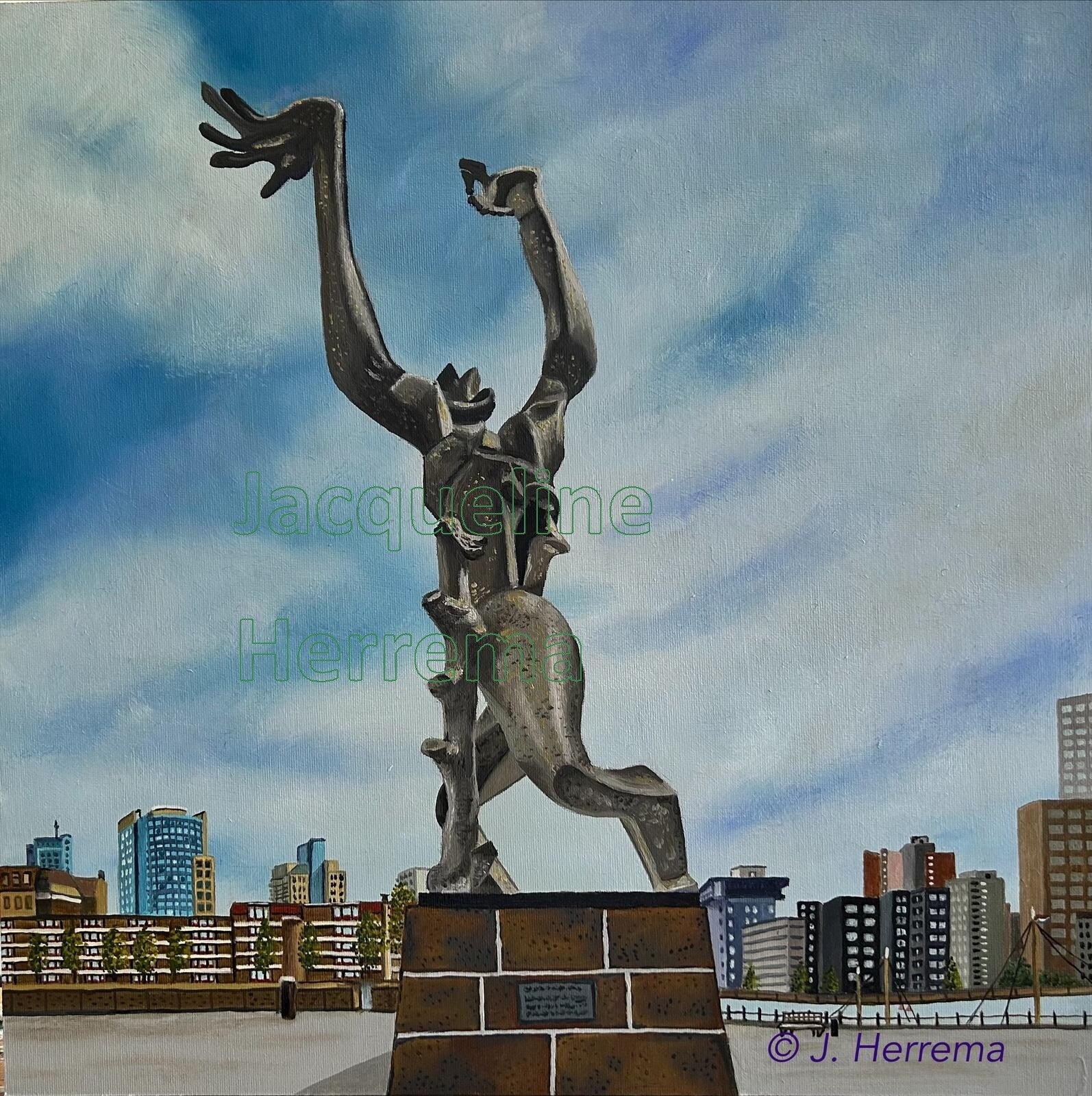 Dit schilderij toont het iconische Beurs-World Trade Center (WTC) in het hart van Rotterdam. Het is een olieverfwerk van de kunstenaar Jacqueline Herrema, die bekendstaat om haar gedetailleerde weergaven van Rotterdamse architectuur.