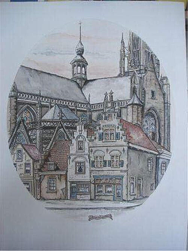 De tekening heeft een ronde compositie en toont de historische architectuur van de stad.