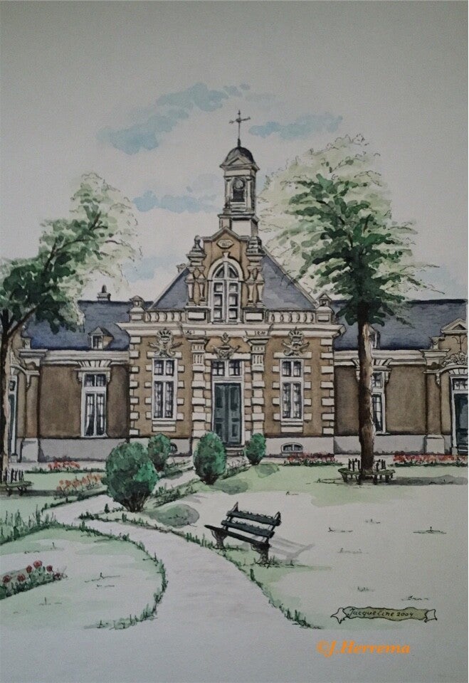 Dit is een sfeervolle afbeelding van een van de meest iconische plekken in Amsterdam. De tekening toont de Zuiderkerk (ook wel de Zuidertoren genoemd), gezien vanaf een van de nabijgelegen grachten, waarschijnlijk de Zandstraat of de Kloveniersburgwal.