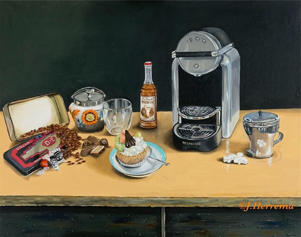 U kunt verschillende soorten olieverfschilderijen en accessoires vinden die een koffiezetapparaat, suikerpot en melkkannetje afbeelden of bevatten.
