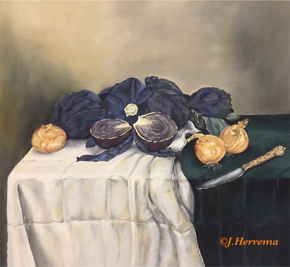 Het kunstwerk toont een koperen kan, een oranje stoofpot, een paprika en venkel op een blauw-wit geblokte doek.